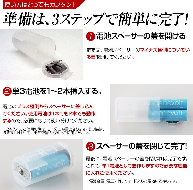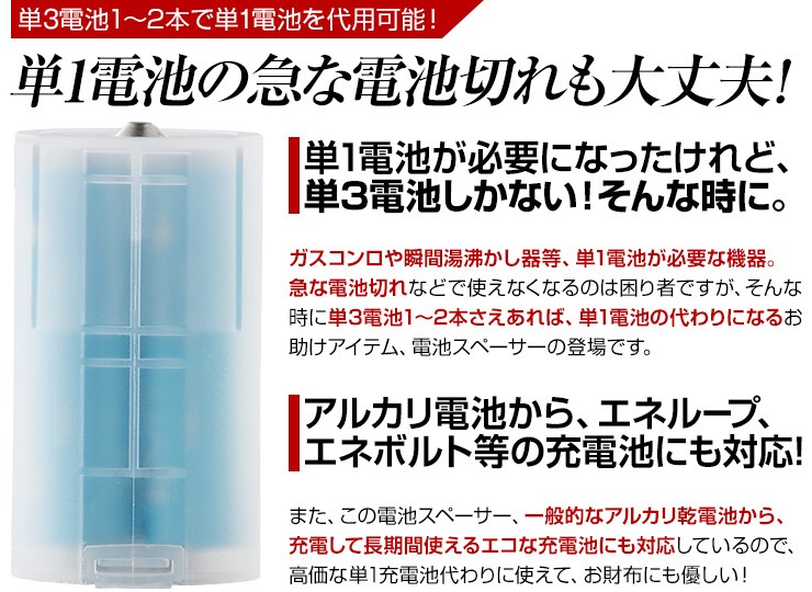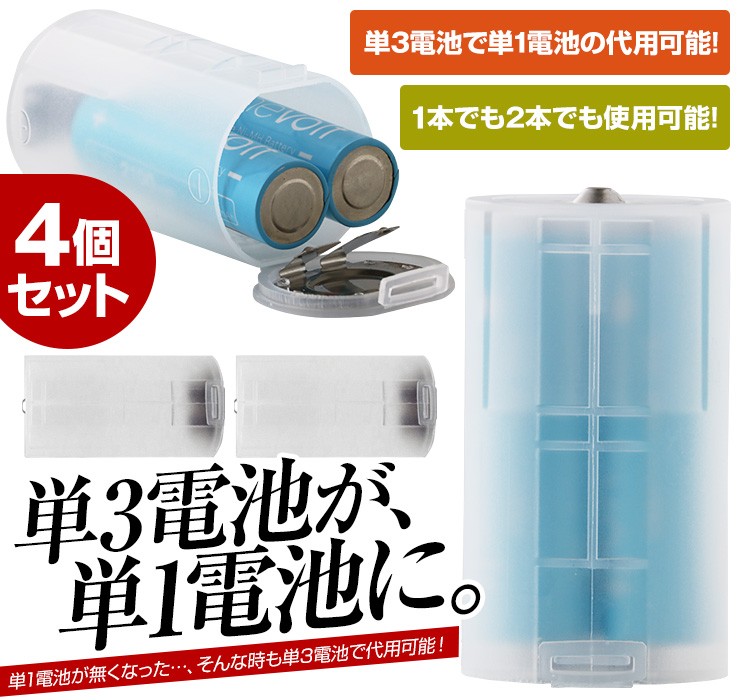 【2014年4月登録】【レビュー記入で送料無料】 単1形 電池スペーサー 電池アダプター 4個セット 単3が単1になる電池アダプター 電池変換 非常用 防災 地震 対策 【単3電池1~2個入れ対応】「単1電池が必要になったけど、単3電池しかない!」そんな時もこれを使えば即解決!単1電池スペーサー4個セット【製品特徴】●単3電池を単1電池に変換できる!●単3電池1~2本両方で利用できます!●蓋を開け、単3電池を入れ蓋を閉じるだけ!※電圧は利用する電池に依存します。※電池は付属しておりません。デジキン