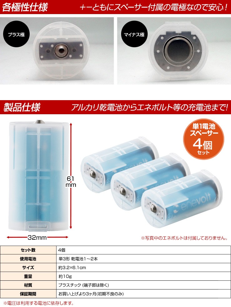 | セット数 | 4個 | | 使用電池 | 単3形 電池1~2本 | | サイズ | 3.2×6.1cm | | 重量 | 10g(スペーサー本体のみ) | | 材質 | プラスチック (端子部は除く) | | 保証期間 | 初期不良のみ3ヶ月対応 | |