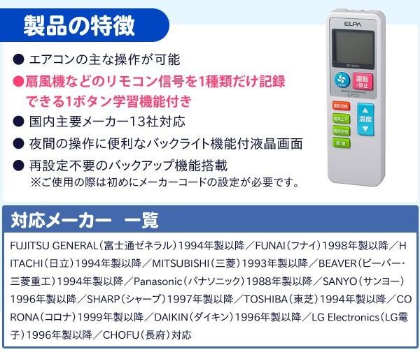 エアコン+扇風機をかんたん操作。13社のエアコンに対応の互換リモコンです。扇風機などのリモコン信号を1種類だけ記録できる1ボタン学習機能付き。夜間の操作に便利なバックライト機能付液晶画面を搭載しています。再設定不要のバックアップ機能も搭載しています。(※ご使用の際は初めにメーカーコードの設定が必要です。) |