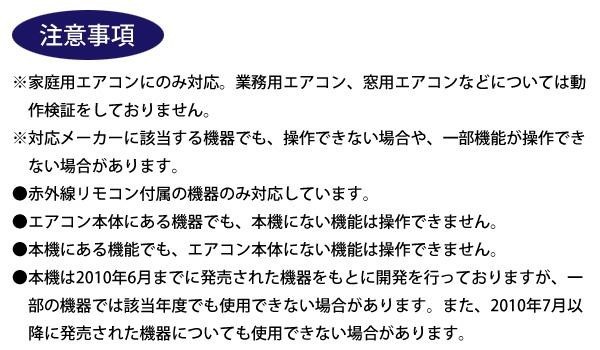 | 仕様 | 動作距離:約7m(※使用機器や部屋の条件により異なる) 電源:DC3V(単四形乾電池×2本・別売) 電池持続時間:約12ヶ月(アルカリ乾電池使用時 ※使用頻度により異なる) ◆対応メーカー FUJITSU GENERAL(富士通ゼネラル)1994年製以降・FUNAI(フナイ)1998年製以降・HITACHI(日立)1994年製以降・MITSUBISHI(三菱)1993年製以降・BEAVER(ビーバー・三菱重工)1994年製以降・Panasonic(パナソニック)1988年製以降・SANYO(サンヨー)1996年製以降・SHARP(シャープ)1997年製以降・TOSHIBA(東芝)1994年製以降・CORONA(コロナ)1999年製以降・DAIKIN(ダイキン)1996年製以降・LG Electronics(LG電子)1996年製以降・CHOFU(長府) |