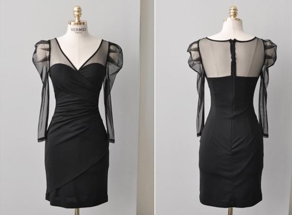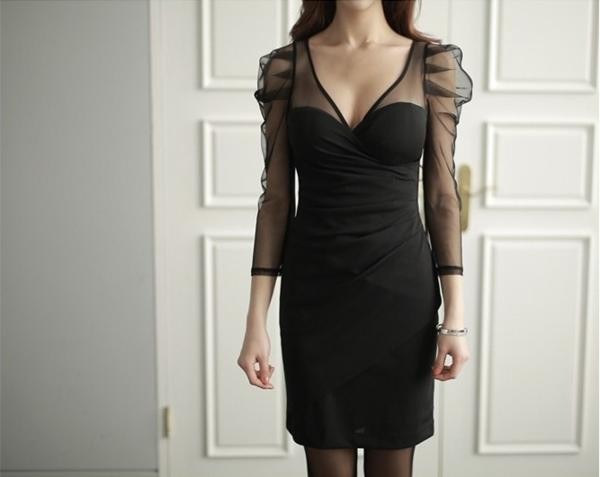 セクシー深Vネック シースルーパフスリーブ タイトワンピース ブラック/L