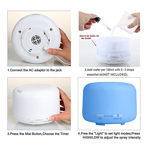 Large 500ml water capacity that can continue use up to 10 hours each time. When time is up or there is no water, it will turn off automatically. Press the "Mist" button, choose the timer from 60 mins, 120 mins, 180 mins or ON