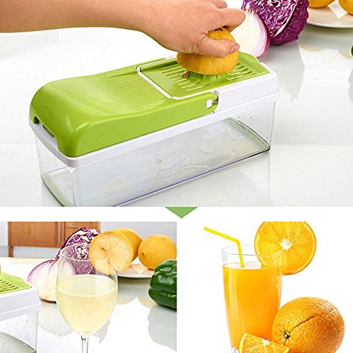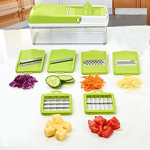 - Multi-function: 10 in 1 Vegetable / fruit cutter, chopper (big/middle/small cubes), slicer, julienne slicer, cheese / vegetable grater (coarse / fine grating) within 7 interchangeable blades. It also has a cone to make lemon juice.
