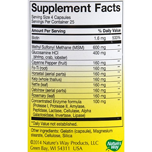 -. Binding : Health and Beauty -. Brand : Nature's Way -. EAN : 5056018909175 -. Feature : Support healthy hair, skin and nails / Specially balanced blend of herbs, enzymes and other nutrients / 7 herb Blend / Premium Formula -. IsAdultProduct : 0 -. Label : Nature s Way -. Manufacturer : Nature s Way -. MPN : AAR903625 -. PackageQuantity : 1 -. PartNumber : AAR903625 -. ProductGroup : Health and Beauty -. ProductTypeName : HEALTH_PERSONAL_CARE -. Publisher : Nature s Way -. Studio : Nature s Way -. Title : Natures Way Hair and Skin with MSM and Glucosamine - 7 Herb Blend - 100 Capsules