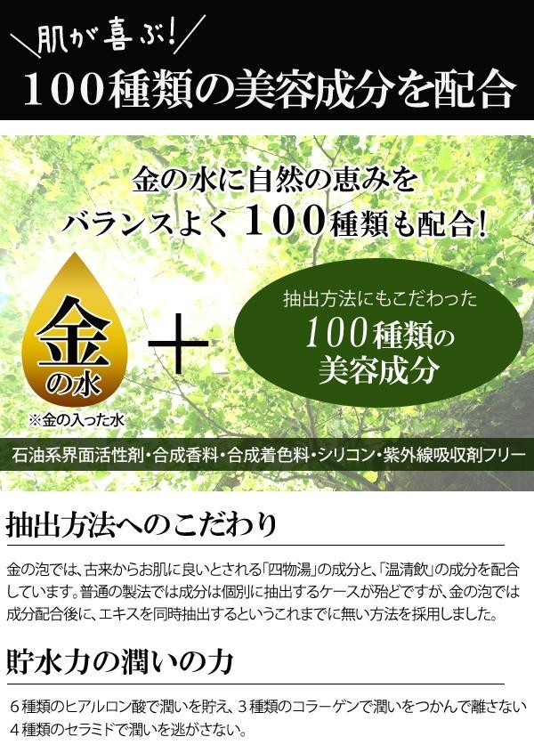 金を配合した水を使用した、粘りのあるもっちり泡が特徴の洗顔フォームです。自然の恵みをバランスよく101種類(100種類+金)も配合し、ナチュラルな美しさを引き出します。泡ネットで泡をたててくるくるとマッサージするように洗顔してください。 |