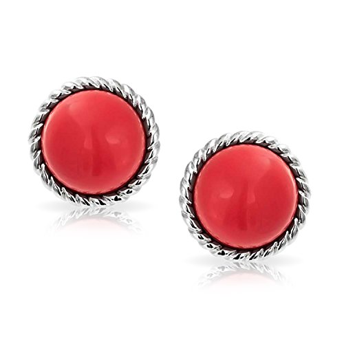 These bali style stud earrings are for pierced ears and have twisted, sterling silver cable borders around a synthetic coral circle. These earrings are the perfect compliment to your summer white, and a great 15mm way to add color to your winter.