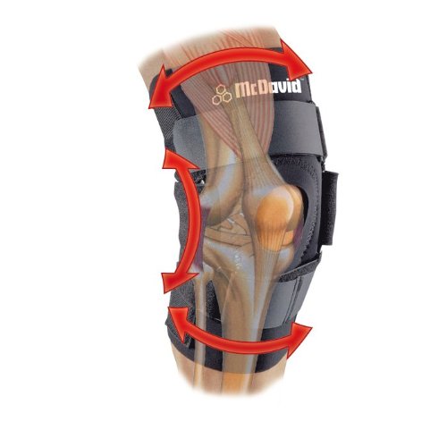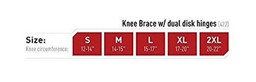 -. Binding : Sports -. Brand : McDavid -. Color : black -. Feature : No Gears; each sidearm is independently articulated with cushioned hyperextension stops / McDavid's lightest hinge: Made with wider arms to aid in maintaining strength. Engineered straps assure personalized fit / Latex-Free neoprene provides compression and therapeutic heat. Open 360 degree padded buttress isolates and supports the patella / Bound edges prevent skin irritation while perforated back panel provides heat and moisture management for all-around comfort, Exterior later of nylon fabric for increased durability. / If at the top of the size chart to select the next size up or if at the bottom of the size chart to go down a size. Fits left or right knee -. Label : McDavid -. Manufacturer : McDavid -. Model : 422R -. MPN : 401 -. PackageQuantity : 1 -. PartNumber : 401 -. ProductGroup : Sports -. ProductTypeName : SPORTING_GOODS -. Publisher : McDavid -. Studio : McDavid -. Title : McDavid 422 Knee Brace with Dual Disk Hinges
