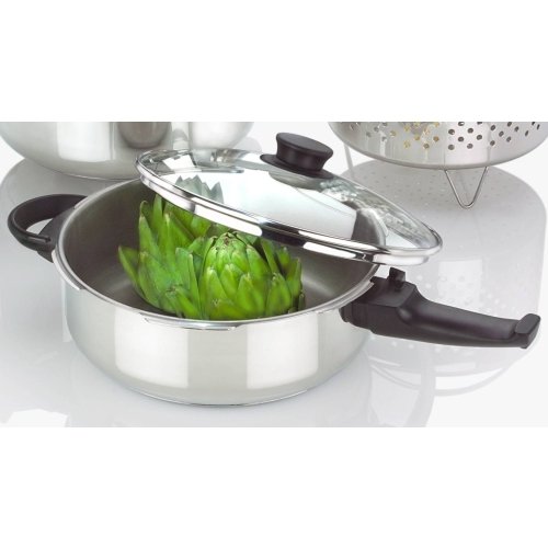 -. Feature : Constructed out of sleek, durable 18/10 stainless steel for long-lasting performance and style / Automatic pressure release setting and visual pressure indicator / Suitable for gas, electric, ceramic and induction cooktops / Includes stainless steel steamer basket with trivet / Black, ergonomically designed handles