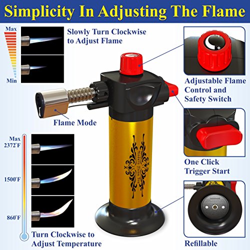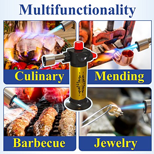 UNIVERSAL AND MULTIFUNCTIONAL - Blow Torch can carry out many functions. Can be used as a Culinary Torch, Creme Brulee Torch, Kitchen Cooking Torch, Food torch, Camping Torch or a Jewelry Torch!