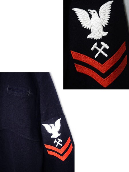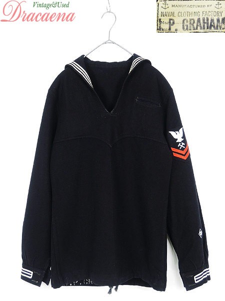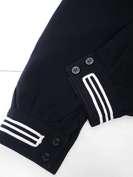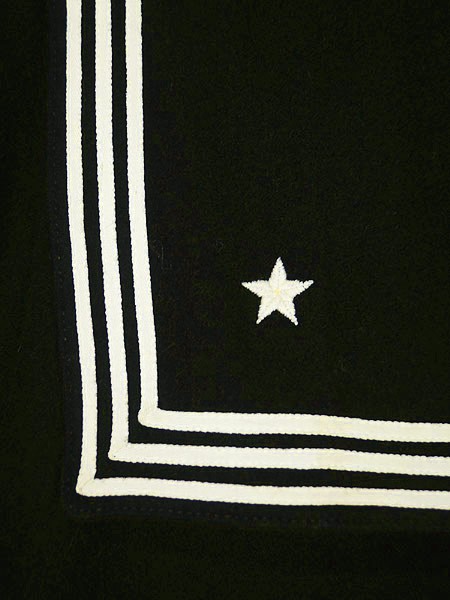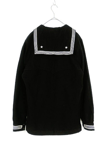 US NAVY、ヴィンテージセーラーシャツ。プルオーバーデザイン。裾裏にステンシル入り。星刺しゅう、白ライン全体に黄ばみ感がありますが古着ならではの良い雰囲気なっています。左袖口ラインに擦れあり。