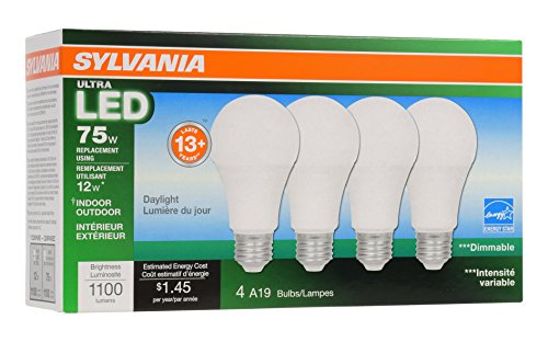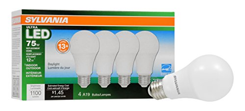Sylvania Home Lighting 74429 A19 Sylvania Ultra 75W Equivalent LED Light Bulb, Dimmable, Efficient 12W Color 5000K (4 Pack), Daylight, 4 Piece