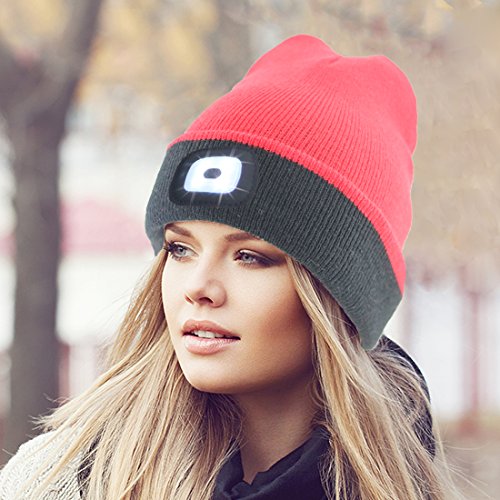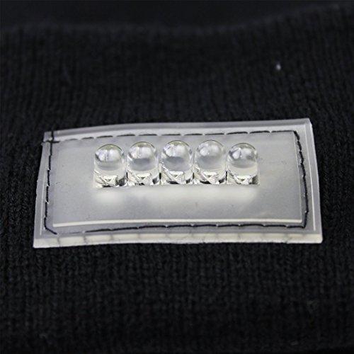 Product Description Stocking Cap with 5 LED Lights Features 100% acrylic material and 5 LED lights. Requires 2 CR2032 lithium batteries (included). One size fits most. 0