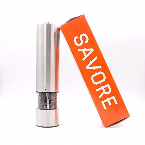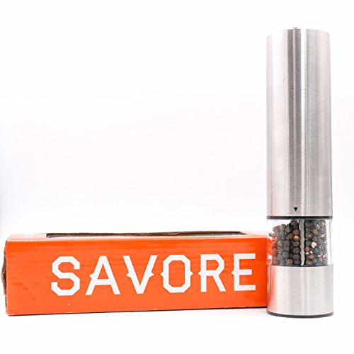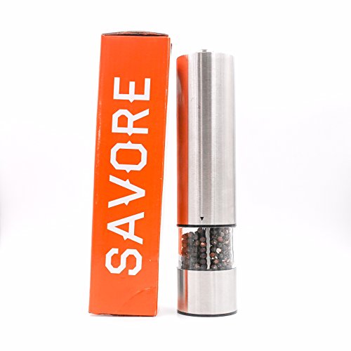 Savore Automatic Electric Salt or Pepper Grinder Mill,Quality Stainless Steel, Battery Powered with LED Light At Bottom Upgrade From Your Regular OXO Shaker