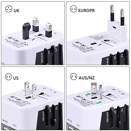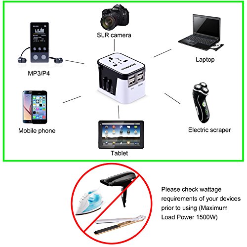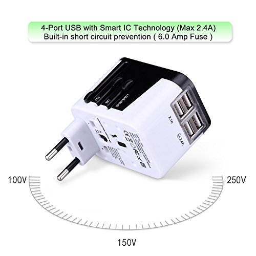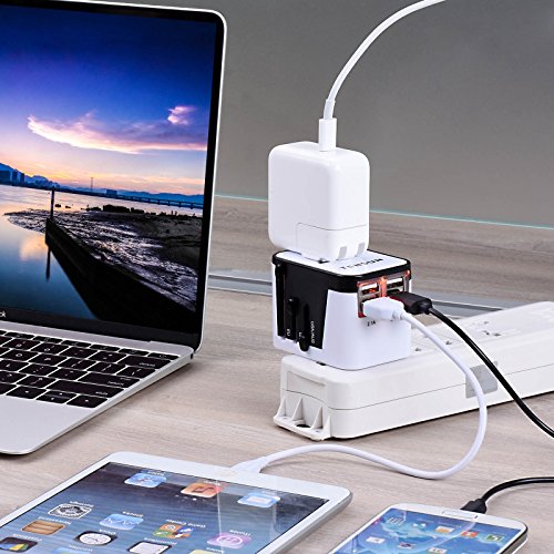 Devices Can Be Charged Four Devices at the same time This international travel adapter with 4 USB outputs (2x2.4A, 2x2.1 ports), you can keep your devices (such as your iPad, iPhone, iPod, Samsung, Sony, Blackberry, HTC, Lenovo, LG, ZTE, Huawei, HTC, MP3 Players, Digital Cameras, PDAs, Smart Mobile Phones, Bluetooth Speakers, Tablets, Headphones, Power Banks and Sat-Nav systems) charged wherever you go for traveling.