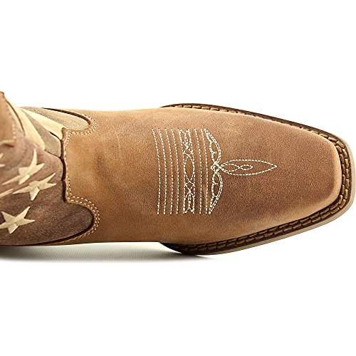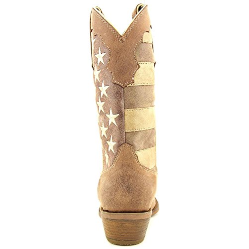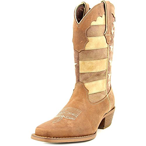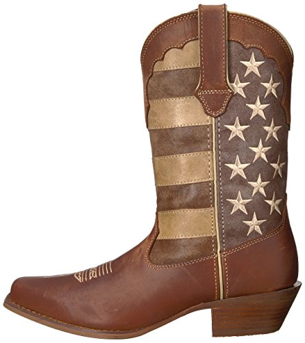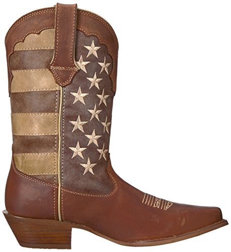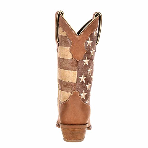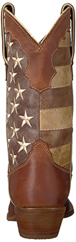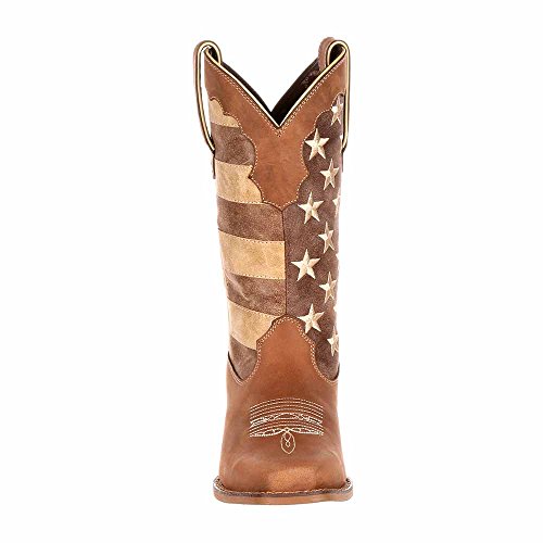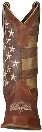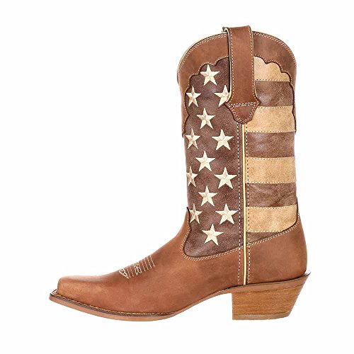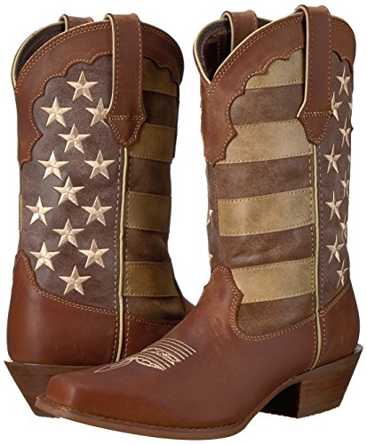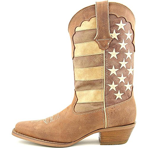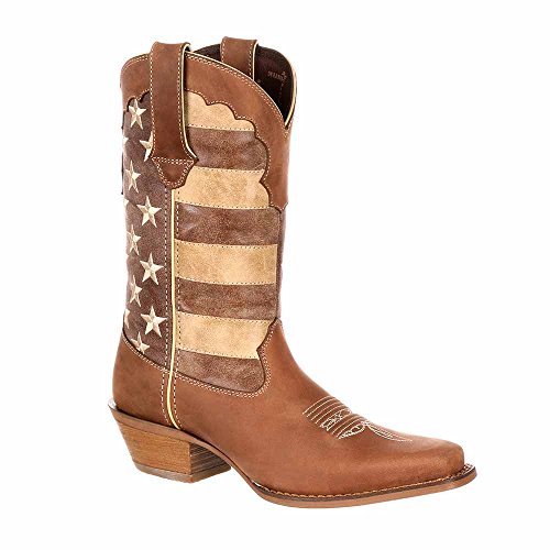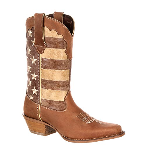 Studio : Durango Publisher : Durango Binding : Apparel Product Description This women's western boot features a faded brown flag, a different take on a flag boot. The front portions of the boot have stripes while the back portions have a field of stars. The Crush by Durango; Women's Distressed Flag Boot has a narrow square toe and a 2-inch heel. The shaft of the footwear is man-made. Full-grain leather is used for the foot, collar, fox and pull straps. Not only does the style of this cowgirl flag boot stand out from other footwear out there, it's comfortable, too. Inside is a Cushion Flex insole. This is a comfortable western boot you can walk in all day. There's also a mesh lining, and the tempered steel shank gives you arch support. This is a 12-inch cowgirl boot. It has a rubber outsole for a comfortable step. The sole has a smooth filigree finish for style. Wear a women's flag boot that's different from the rest. Get this faded flag boot! 0