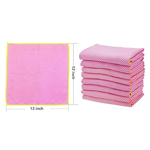 Microfiber Glass Cloth, Quick Drying, Quick Absorbent, No Lint, No Scratch, Diamond Weave Design, 12" x 12", Pink, (8 Pack)