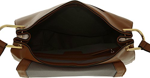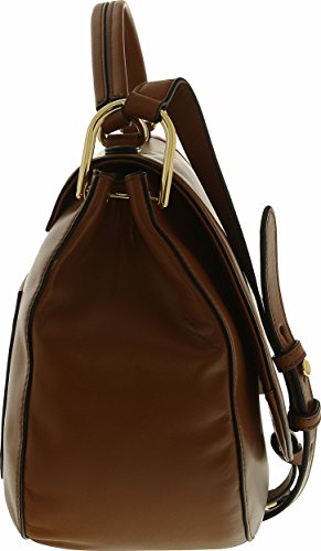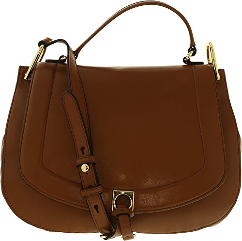 Flap closure. Top carrying handle with adjustable shoulder strap. Exterior front and back slip pockets. Signature logo hardware detail in back. Flat base to provide upright structure. Lined interior. Interior zip pocket and key hook. Three interior slip pockets.