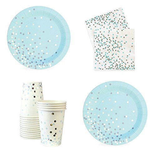 -. Brand : FAKKOS -. Color : blue, silver -. EAN : 0738076840083 -. Feature : Elegant Party Supply Pack for 12 Guests - Dessert/Appetizer Party / 12 - Blue and Silver Confetti Paper Plates With Gold Foil Stamp (7.25") / 12 - Blue and Silver Confetti Hot/Cold Paper Cups (9oz.) With Gold Foil Stamp / 20 - Blue and Silver Large Matching Napkins / Perfect for a baby shower, bridal shower, birthday party or any elegant upscale designed party -. Label : Combined -. Manufacturer : Combined -. ProductGroup : Kitchen -. ProductTypeName : KITCHEN -. Publisher : Combined -. Studio : Combined -. Title : Blue and Silver Confetti Party Supplies - Elegant Silver Foil Stamp paper Party Supplies For 12 Guests Including paper Dessert/Appetizer Plates, Napkins & Cups BRIDAL BABY BIRTHDAY -. UPC : 738076840083