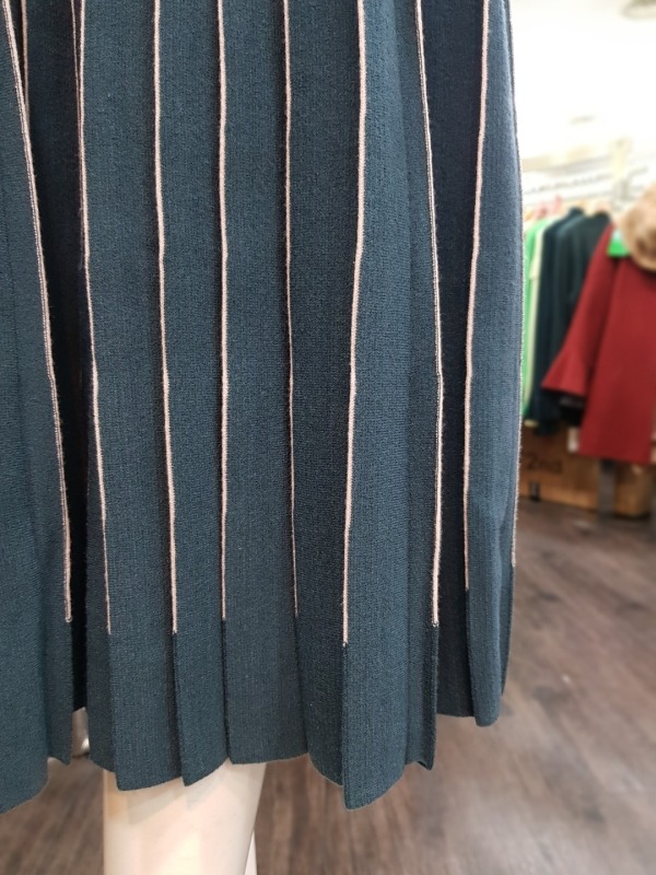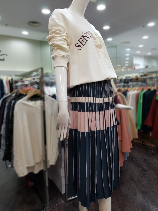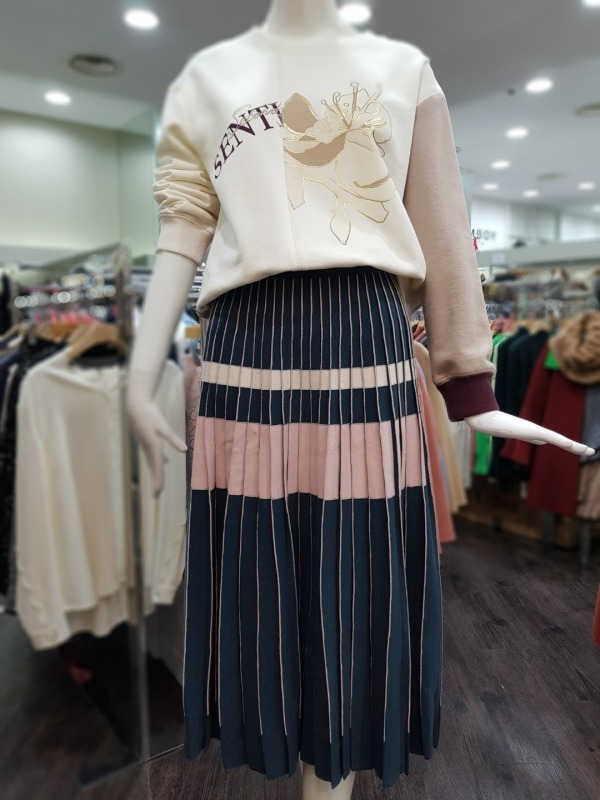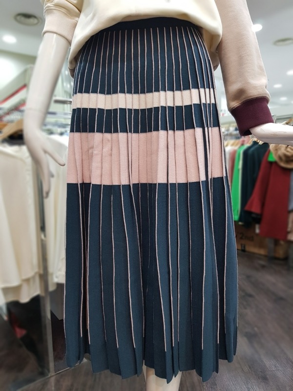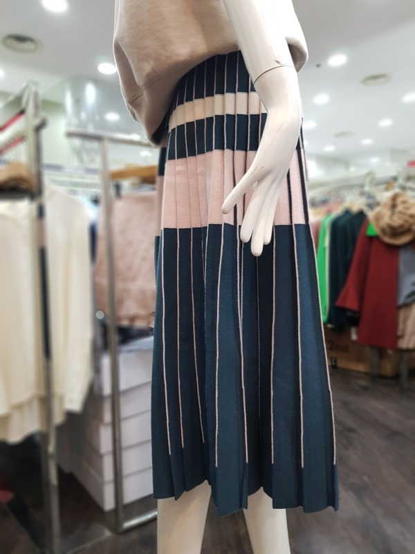 74CM 정도의 플리츠 니트 스커트로 허리밴딩 처리로 편안한 착용이 가능하며 배색 스트라이프 디테일이 돋보이는 프커트 입니다. ?