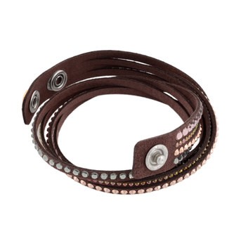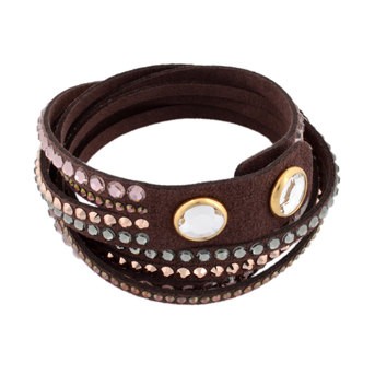 スエード調のチョコレートカラーの人工皮革に大きさの異なるクリスタルをちりばめた2重巻タイプ(8連)のブレスレット。手元に優しく巻きつくデザインが魅力的です。留め具のクリスタルボタンも美しく、装いを華やかに演出してくれます。どんなスタイルにも合わせやすいオシャレアイテムです。