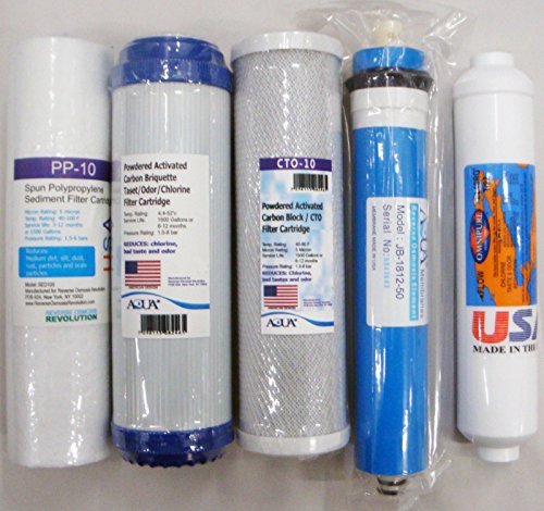 -. Feature : 5 stage Reverse Osmosis Replacement Filter set with 50 GPD membrane, USA / 3 Prefilters size of 10"x2.5": Sediment 5 micron, GAC, CTO 5 micron / 50 GPD US Made Membrane / 5 Micron Inline post filter with T33 carbon, made Omnipure USA (CL10ROT33), with 1/4" elbow fitting