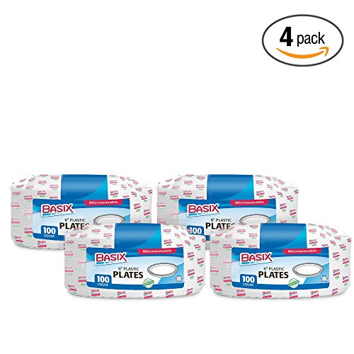 Basix 100 Count Disposable Plastic Plates Microwave Safe 6-Inch, White Pack Of 4
