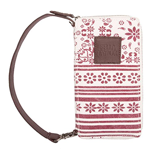 Product Description A little goes a long way with our Kayla Modern Wristlet Wallet. With a refreshingly modern floral print, the Kayla also features solid stripes, rows of simplified flowers and a coffee brown leather wrist strap. Wristlet Wallet: H 7" Base: W 3.5" x D 1" 0