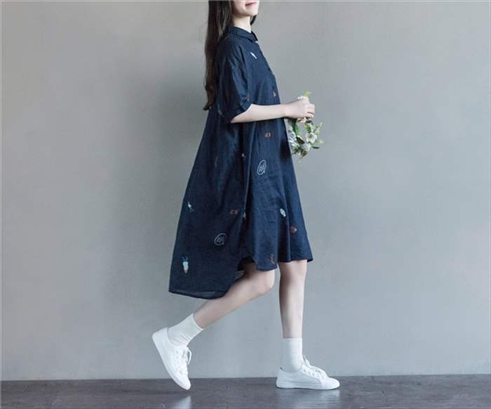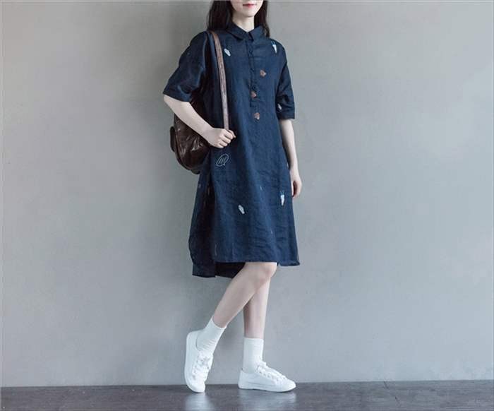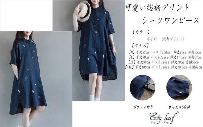 ・全体にプリントを施した、プルオーバータイプのシャツワンピース。 ・裾は後ろ下がりのテールカットとなっており、子供っぽい印象になりがちな総柄ワンピにも女性らしい上品な印象をプラス。 ・ゆったりシルエットのプルオーバータイプとなっており、体型カバーにもバッチリ。 ・首元のボタンを外せば、ラフに着れる為、普段着としては勿論、部屋着としてもオススメです。 ★サイズ展開 【M】着丈97cm バスト108cm 袖丈17cm 肩幅55cm 【L】着丈98cm バスト112cm 袖丈17.5cm 肩幅57cm 【XL】着丈99cm バスト116cm 袖丈18cm 肩幅59cm 【XXL】 着丈100cm バスト120cm 袖丈18.5cm 肩幅61cm※平均での採寸となりますので、多少の誤差が生じる場合がございます。ご了承くださいませ。★カラー展開 ネイビー(総柄) ★商品詳細 【素材】:コットン100% 【透け感】:なし 【厚み】:やや薄め【裏地】:なし 【シルエット】:ゆったり 【伸縮性】:なし【付属品】:なし (コーディネート使用の衣類、アクセサリー等は付属しません)20代 30代 40代 50代 人気 レディースファッション 大きいサイズ
