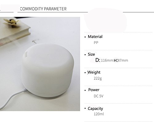 Size:116*87mm. Weight:222g Timer: 10S intermittent/ 2H/ 4H/ Continuous modes Ultrasonic Frequency:2.4 MHz - Advanced Ultrasonic Diffusing Technology Duration Time:Do not use for more than 10 hours.When time is up or there is no water,it will turn off automatically LED Light:7 pcs - Independent Light Control / Multiple Color Light / Gradual Changing or Fixed Mode or Off.Provides soft illumination. Capacity:120 ml Main Material:PP,ABS Package Contents: 1 x 120ml Aroma Diffuser 1 x Charger Adaptor 1x User Manual. 0