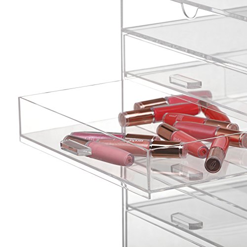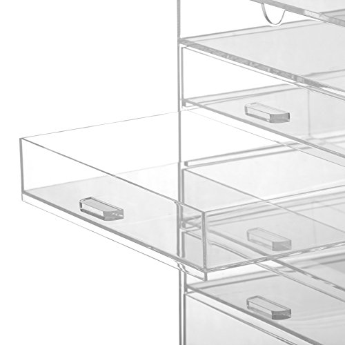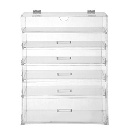 - Feature : Stylish transparent cosmetic box - the chic way to store makeup, jewellery and accessories / Large six tier design features five drawers plus an upper compartment with hinged flip top lid. Includes removable divider / Made from strong high grade moulded acrylic, built to withstand frequent daily use / Ideal for use in the home or professional makeup studio / Size: 15 x 12 x 12 inches