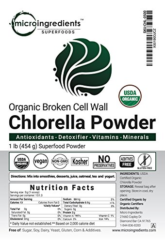 Micro Ingredients USDA Organic Chlorella Powder. 100% pure, vegan, no additives or preservatives, fillers free, non-gmo, gluten-free, no artificial colors or flavors.
