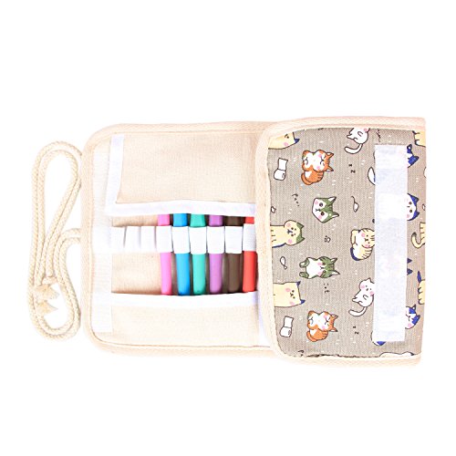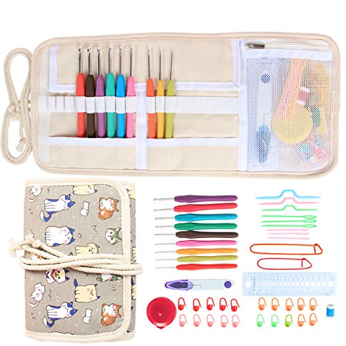 Damero Ergonomic Crochet Hooks Set, Travel Canvas Roll Organizer with 9pcs 2mm to 6mm Soft Grip Crochet Hooks and Complete Knitting Accessories, All in One, Easy to Carry, Cartoon Cats
