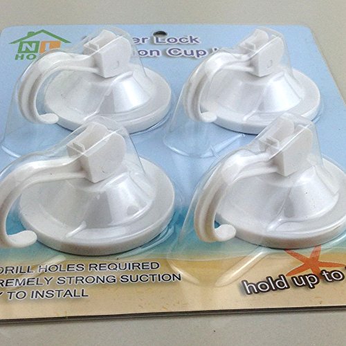 Innovative power lock design provides maximum suction on smooth non-porous surfaces such as tile glass fiberglass and some metals. Suction hooks attach by simply pushing the cup against a surface and locking the hook into place. Suction seal is released when hook is lifted back up.