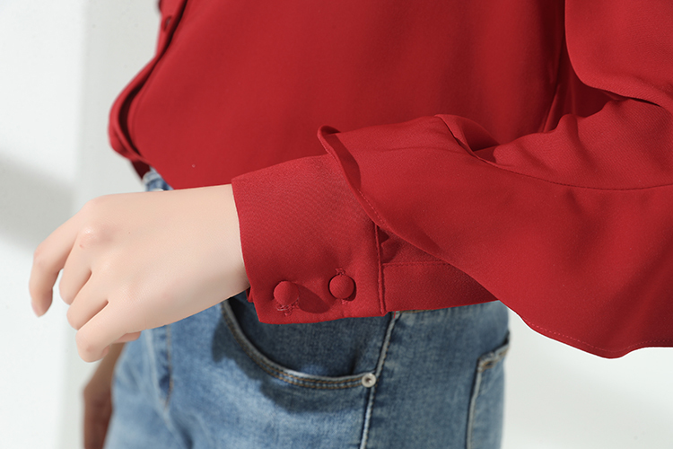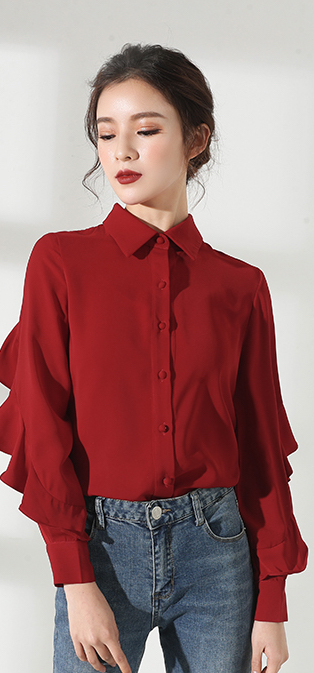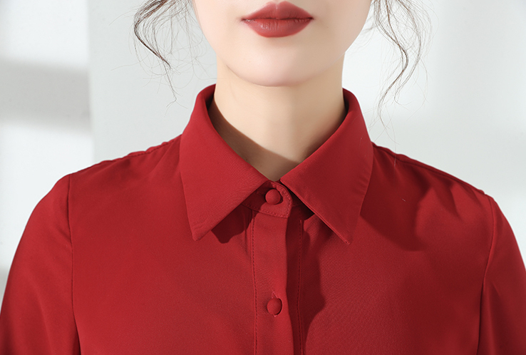 深みのあるレッドが大人っぽく、セクシーな雰囲気のきれいめ長袖ブラウスです。