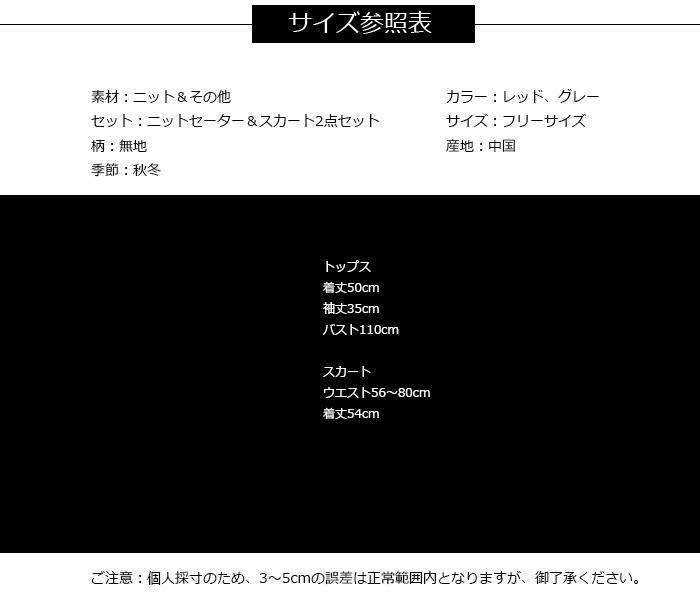セットアップ 上下セット ニットセット ニットセーター スカート 2点セット チュニック 着やせ 大人カジュアル 2018秋冬新作 セットアップ レディース 上下セット ニットセット 着やせ 商品詳細素材:ニット&その他セット:ニットセーター&スカート2点セット柄:無地季節:秋冬カラー:レッド、グレーサイズ:フリーサイズ産地:中国サイズ参照表フリーサイズトップス着丈50cm袖丈35cmバスト110cmスカートウエスト56~80cm着丈54cmご注意:個人採寸のため、3~5cmの誤差は正常範囲内となりますが、ご了承ください。セットアップ 上下セット ニットセット ニットセーター スカート 2点セット チュニック 着やせ 大人カジュアル 2018秋冬新作 セットアップ レディース 上下セット ニットセット 着やせ