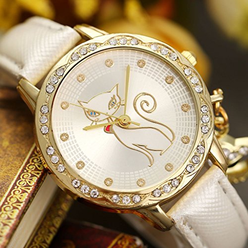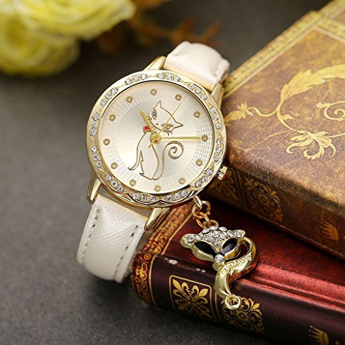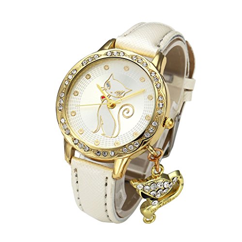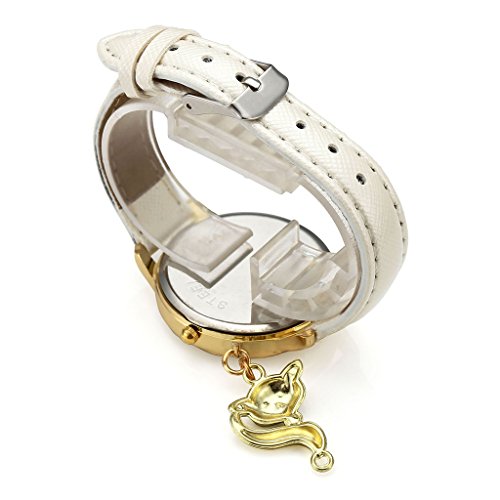 Top Plaza Women Fashion Golden Rhinestone Case Cat Dial White PU Leather Band Quartz Wrist Watch with Cat Charm