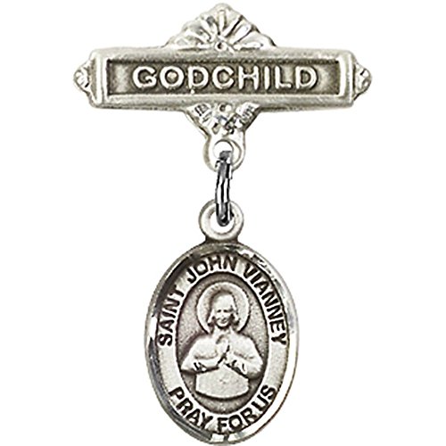 -. Title : Sterling Silver Baby Badge with St. John Vianney Charm and Godchild Badge Pin 1 X 5/8 inches
