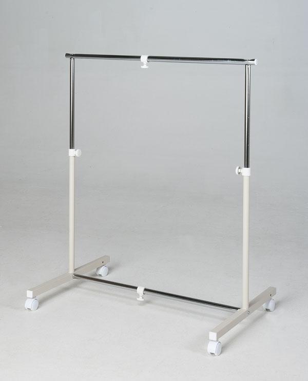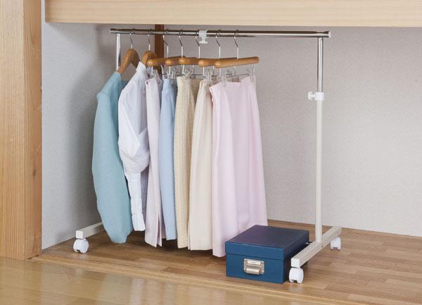 | クローゼットに据え付けのハンガーバーの下部を利用して、更に衣類収納スペースを作る事が出来ます。高さ奥行きを従来のハンガーより抑えました。下部補強パイプは、後部でも中央部でも使用目的によって、使い分けられます。キャスターとアジャスターが付いて、使い分け出来ます。 |