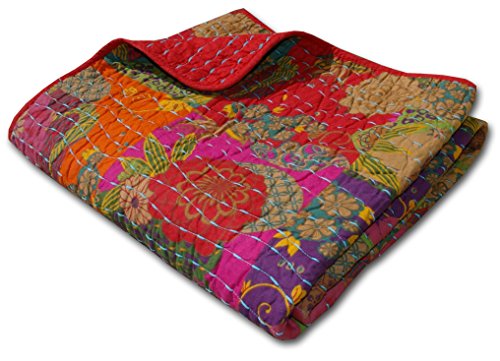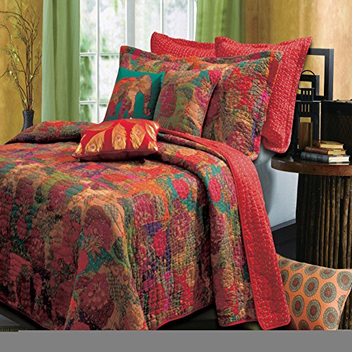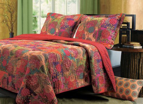 This global fusion quilt set features a stylized floral and fruit print in bright jewel tones over-stitched in random waves of bright blue yarn. Retro-modern styling reverses to a coordinating solid color with contrasting quilting. Machine quilted in thick, bright yarn for durability. Size: About 50x60".Feature