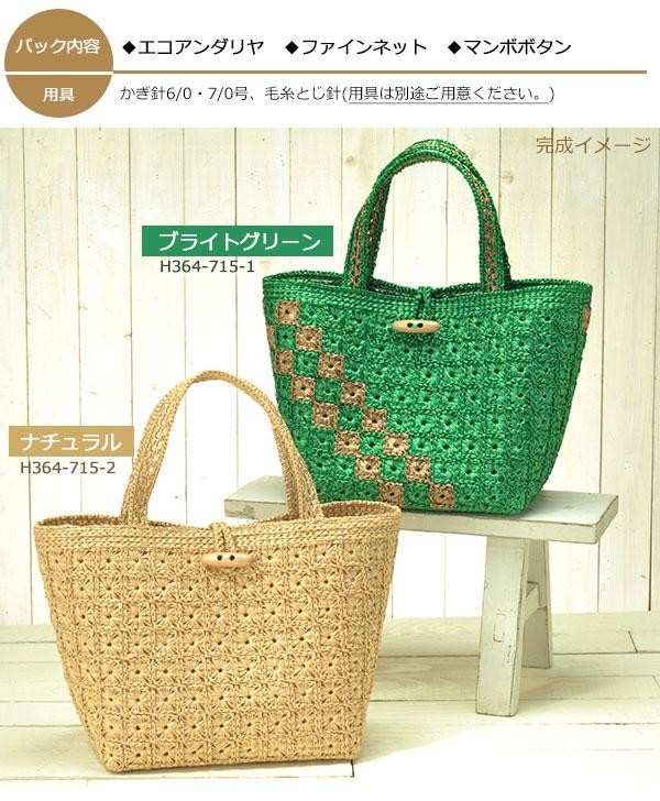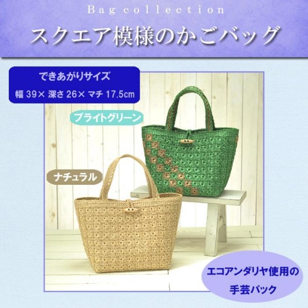 材料とテキストをセットした「手芸パック」です。成形したネットにかぎ針で糸を編みつけていくタイプです。オリジナルバッグでお出かけもさらに楽しくなります♪ |