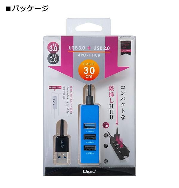 コンパクトな縦挿し4ポートハブです。底面マグネット付きでスチールデスク等に固定できます。4ポートのうち1ポートが「USB3.0」、3ポートが「USB2.0」対応となっています。 |