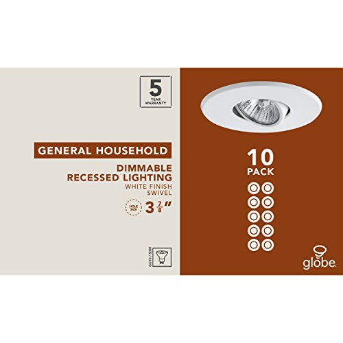 Globe Electric's 10 pack 4" Swivel Spotlight Recessed Lighting Kit with round trim and white finish is the perfect way to brighten up the interior of your home or commerce with style. Featuring patented PUSH-N-CLICK clips which are fully adjustable and extra wide to grip uneven surfaces and provide easy tool-free installation. A swivel light bulb gives you the ability to focus light on specific areas and can be directed for any desired look. An integrated cut-off switch ensures that the fixture will not overheat and can be used with or without an insulation box. Requires ten 50W equivalent MR16 GU10 light bulbs (sold separately). Dimmable with compatible bulb and dimmer switch.Feature