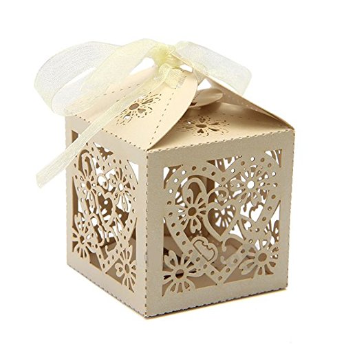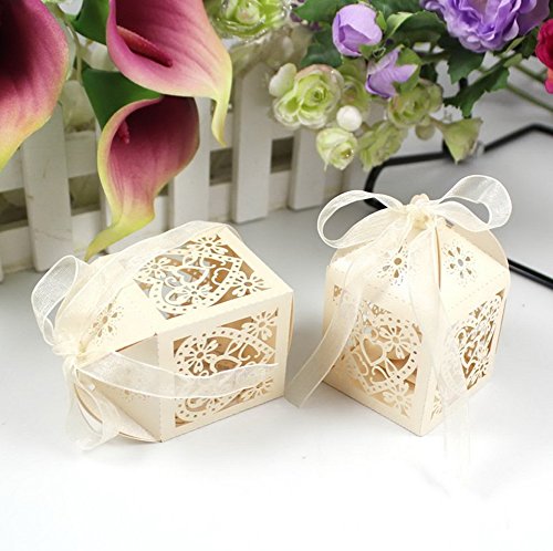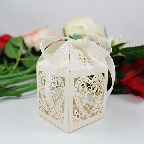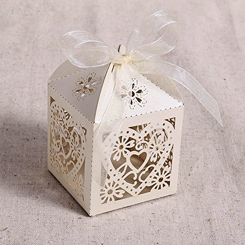 50PCS Laser Cut Gift Boxes, 2''x2''x2''Love Heart Wedding Boxes with 50 Ribbons for Party Favors(Ivory)