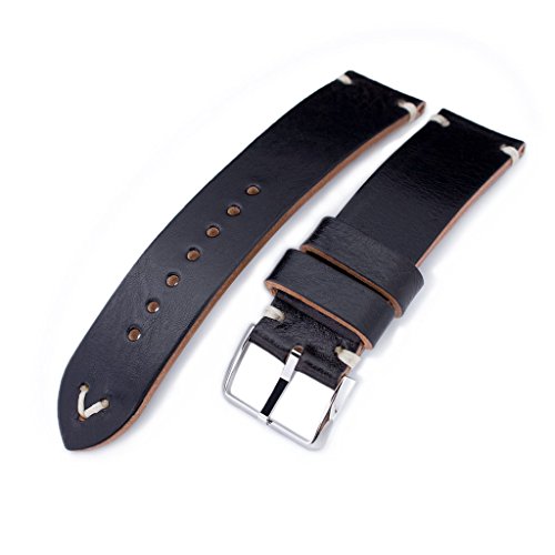 -. Title : 21mm MiLTAT Black Genuine Calf Leather Watch Strap, Beige Stitching, Polished Buckle