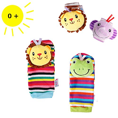 Sue's 4PCS Baby Wrists Rattle and Foot Finders Socks Set Infant Developmental Soft Animal Toy Gift - Elephant and Lion