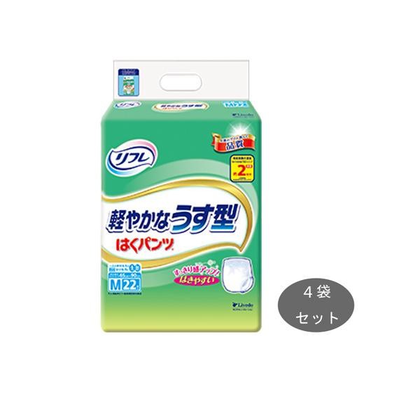ウエスト部分が軽い力でぐーんと伸びて、上げ下げカンタン!うす型吸収体と股下すっきりカットで、ゴワゴワせず動きやすいうす型パンツです。 製造国:日本 素材・材質:不織布 仕様:吸収量(目安):おしっこ約2回分適応サイズ(ウエスト):65~90cm ※サプライヤー直送品 ご注文後3~4営業日後の出荷となります【商品名】リフレ はくパンツ 軽やかなうす型 Mサイズ 22枚 17432 ×4袋セット