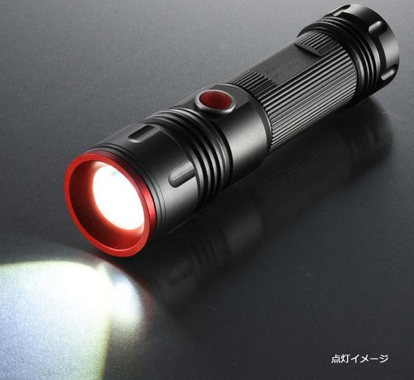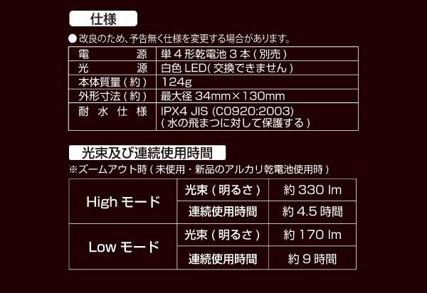 ズーム機能搭載なので、遠くを強く、近くを広く照らします。明るさ調整、点滅機能も付いています。
