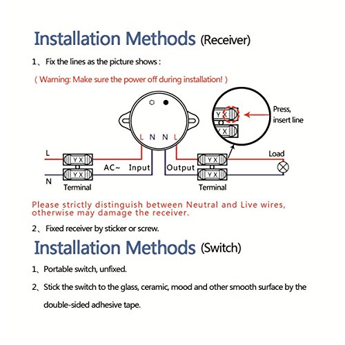 ♥A switch can pair with some receivers to accomplish one switch controls several lights,and a receiver can pair with several switches to accomplish three-wireway switch system,multi-wireways switch system.Small receiver easily fits into wiring boxes like canopy,junction box,electrical box.Place switch on any place you want or use as a portable remote.