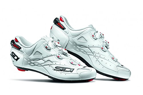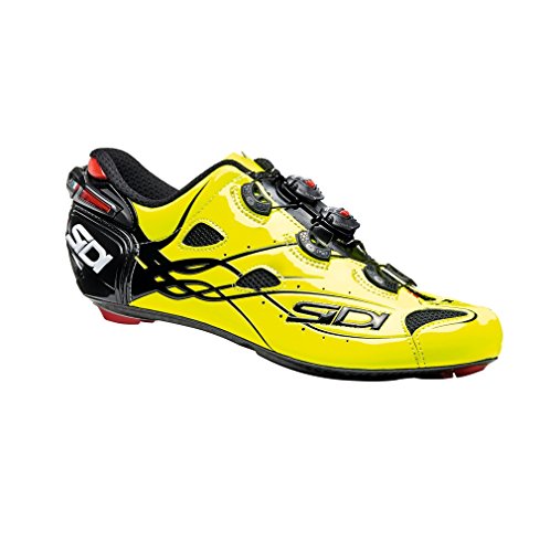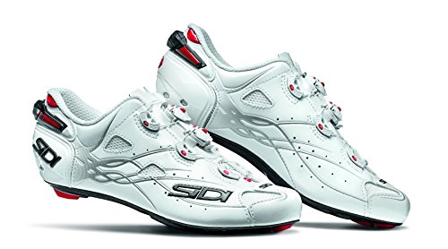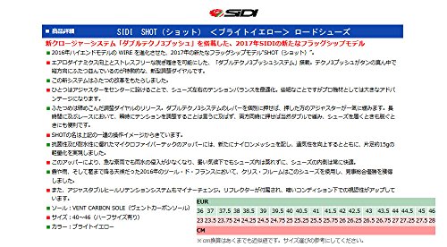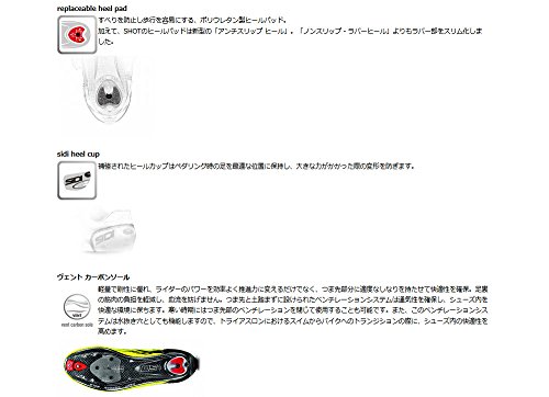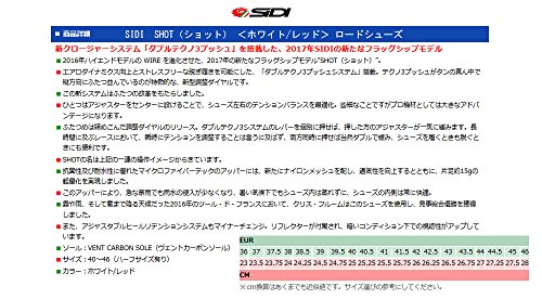 Binding : Apparel Product Description The Shot is the latest top-of-the-range shoe from Sidi, as worn by the stars of the pro-peloton. Always a favourite with cycling's biggest stars, Sidi has innovated once again with Shot, a new range-topping shoe that builds on the ever-popular Wire Carbon with a redesigned aerodynamic upper and central Tecno-3 dials that close the shoe symmetrically for an even better custom fit. Already spotted on the feet of Chris Froome at the Criterium du Dauphine, the shoe is already pro-tested and approved. The Shot's Microfibre TechPro upper features all the stylish design you'd expect from Sidi's more than 40 years at the top of the sport. Updates include striking new embossed graphics, which are designed to aid airflow around the shoe and increased venting above the toebox and the side of the shoe to keep feet cooler at the peak of summer racing. Speaking of staying cool, the Shot uses the same Vent Carbon sole as the Wire Carbon, a beautifully finished 3K carbon checkerboard that balances performance-enhancing stiffness with engineered give in the toes to boost ergonomics. The sole also boasts a sliding vent at the toe, which allows riders to tailor their desired level of airflow through the underside of the toebox. The heel pad and toe guard are also replaceable should they wear thin. 0