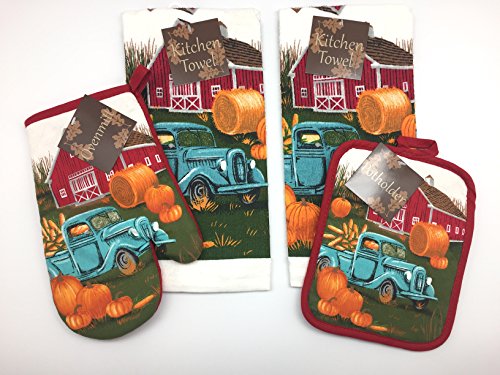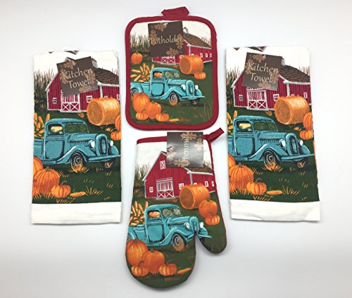 THANKSGIVING FARMHOUSE HARVEST KITCHEN DISH TOWELS AND POT HOLDERS SET: BRINGING HOME THE PUMPKIN BREAD, 4 PC.